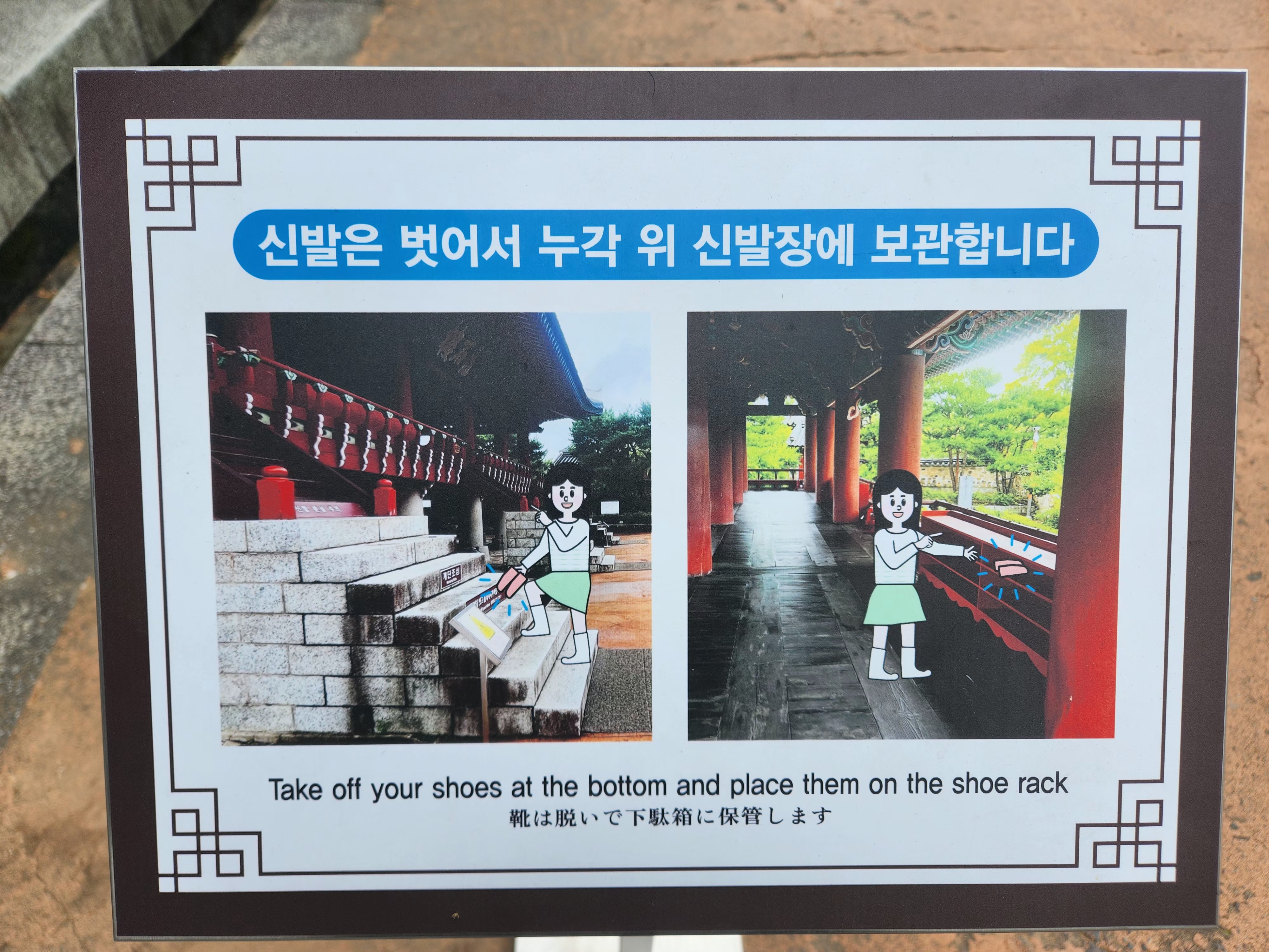 촉석루에 오르기 전, 신발을 벗고 누각 위 신발장에 보관하라는 안내가 쓰여있네요.