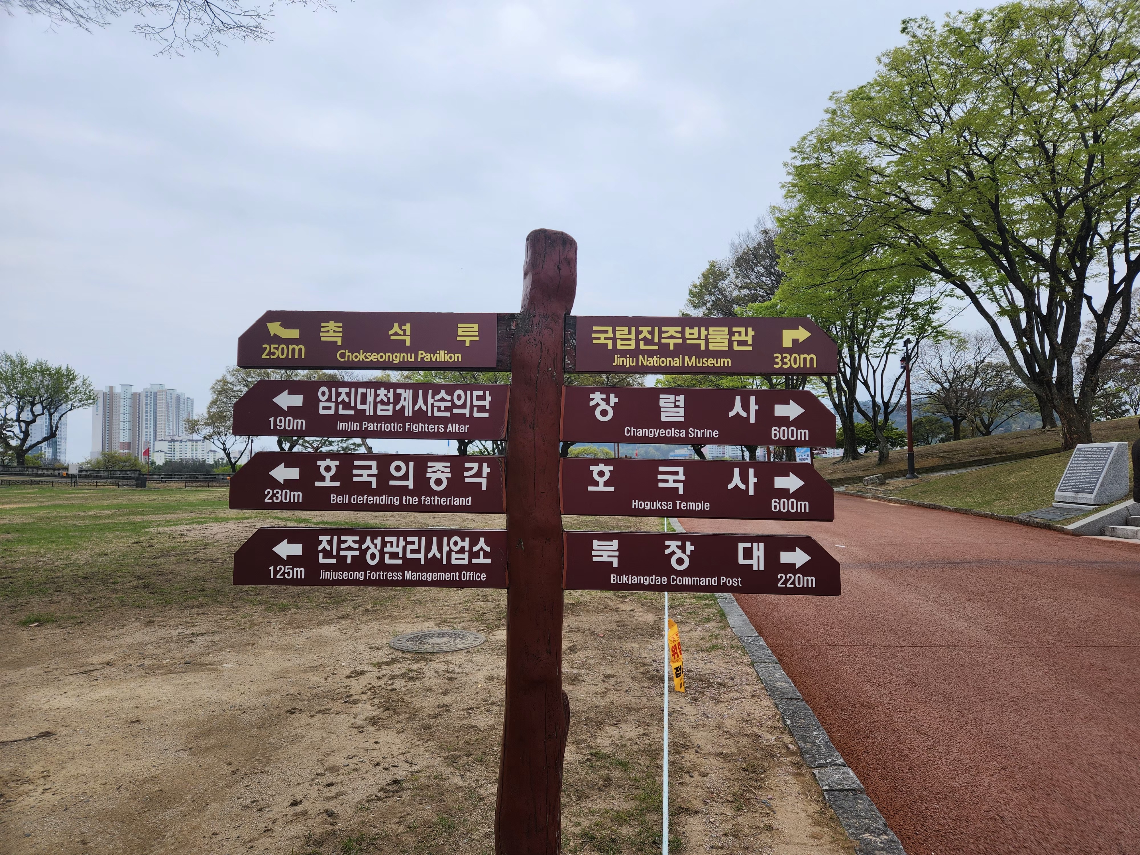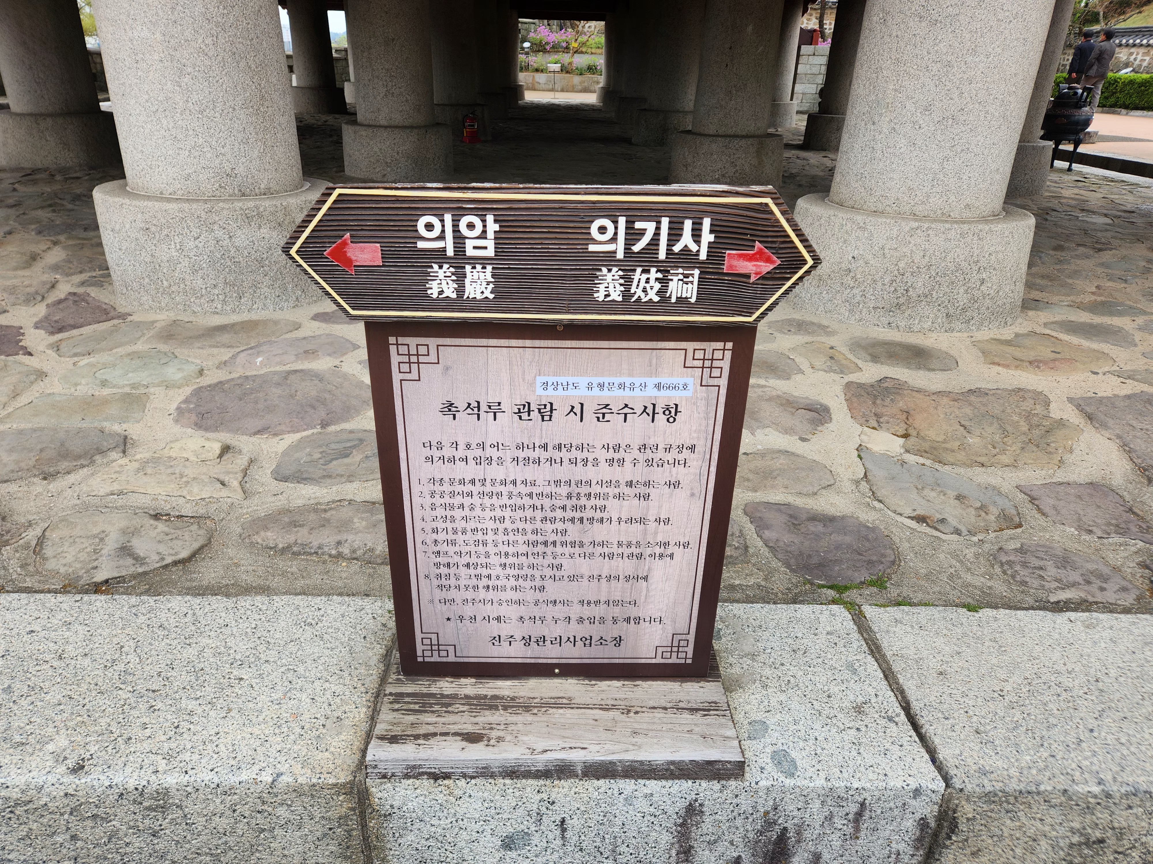 안쪽으로 더 들어가니 이정표가 보였고, 저는 촉석루로 향하는 길을 따라 천천히 걸어갔습니다. 혼자여서인지 더 느긋하게, 오롯이 제 감각만으로 이곳을 담아낼 수 있었던 시간이었어요.
