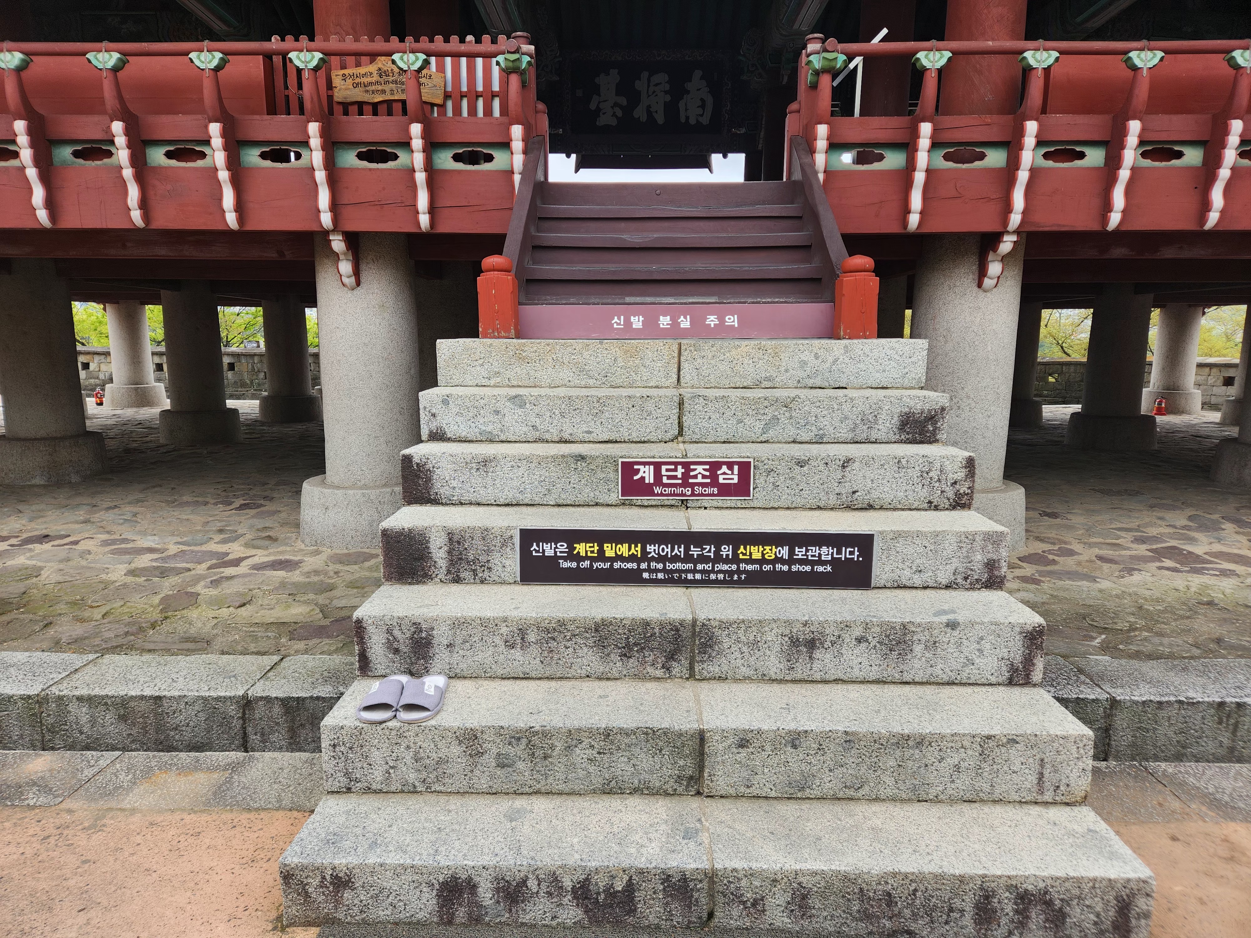 촉석루에 오르기 전, 신발을 벗고 누각 위 신발장에 보관하라는 안내가 쓰여있네요.