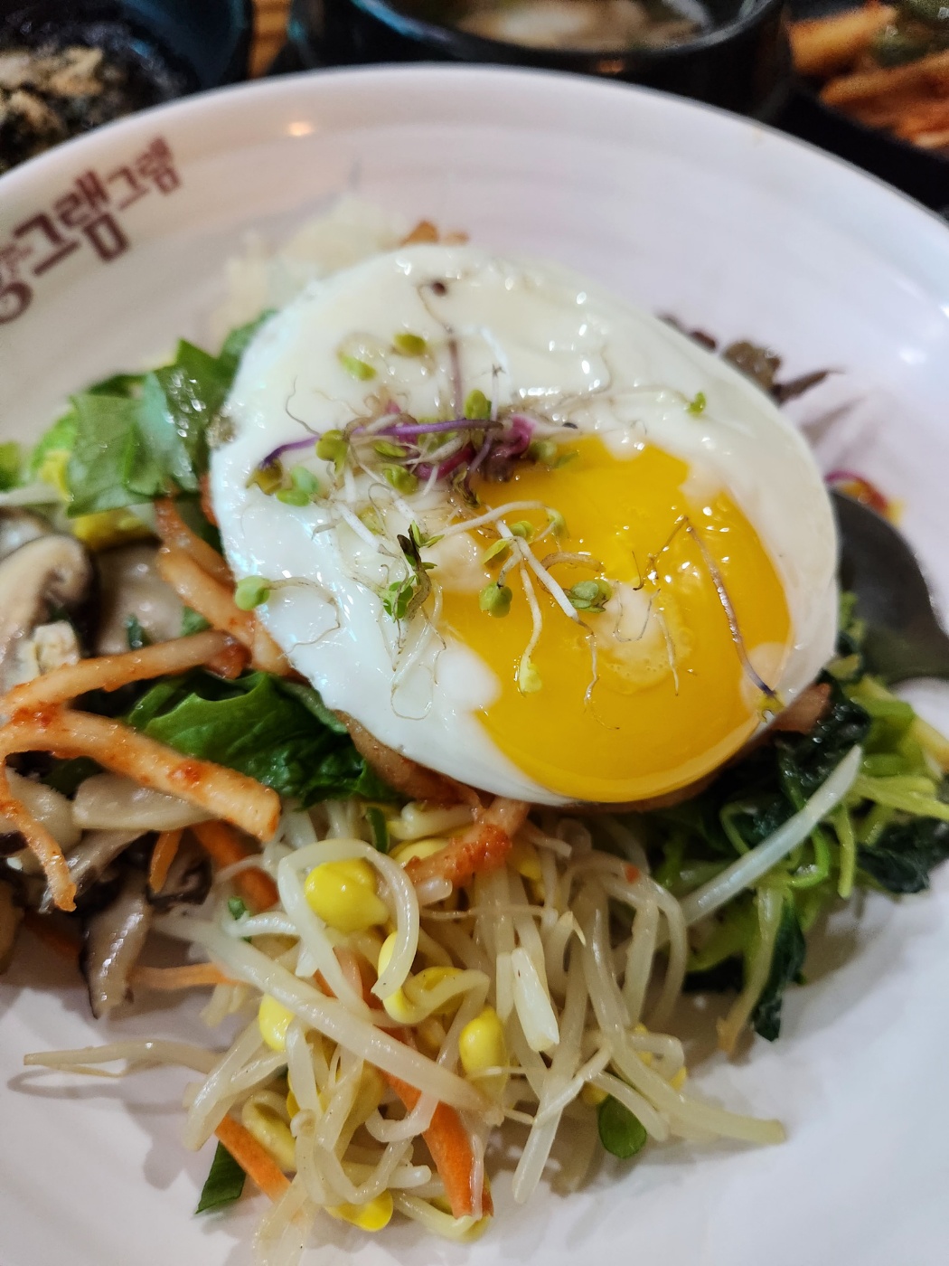 비빔밥을 시키니 밥은 쌀밥과 보리밥을 반반 섞어 넣어주셨고 그 위에 콩나물, 표고버섯, 생체, 새싹, 계란, 무나물, 고기등 가지가지 나물들이 함께 올라와 있어요.