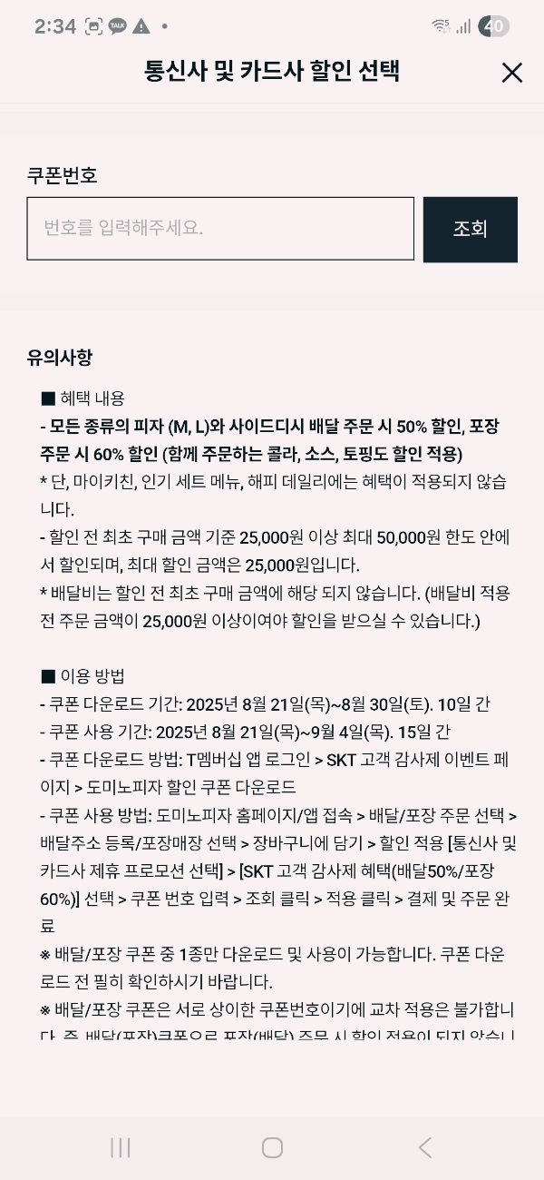 - 포장 쿠폰과 배달 쿠폰은 쿠폰 번호가 서로 다르며, 주문 방식과 일치하지 않으면 할인이 적용되지 않습니다.