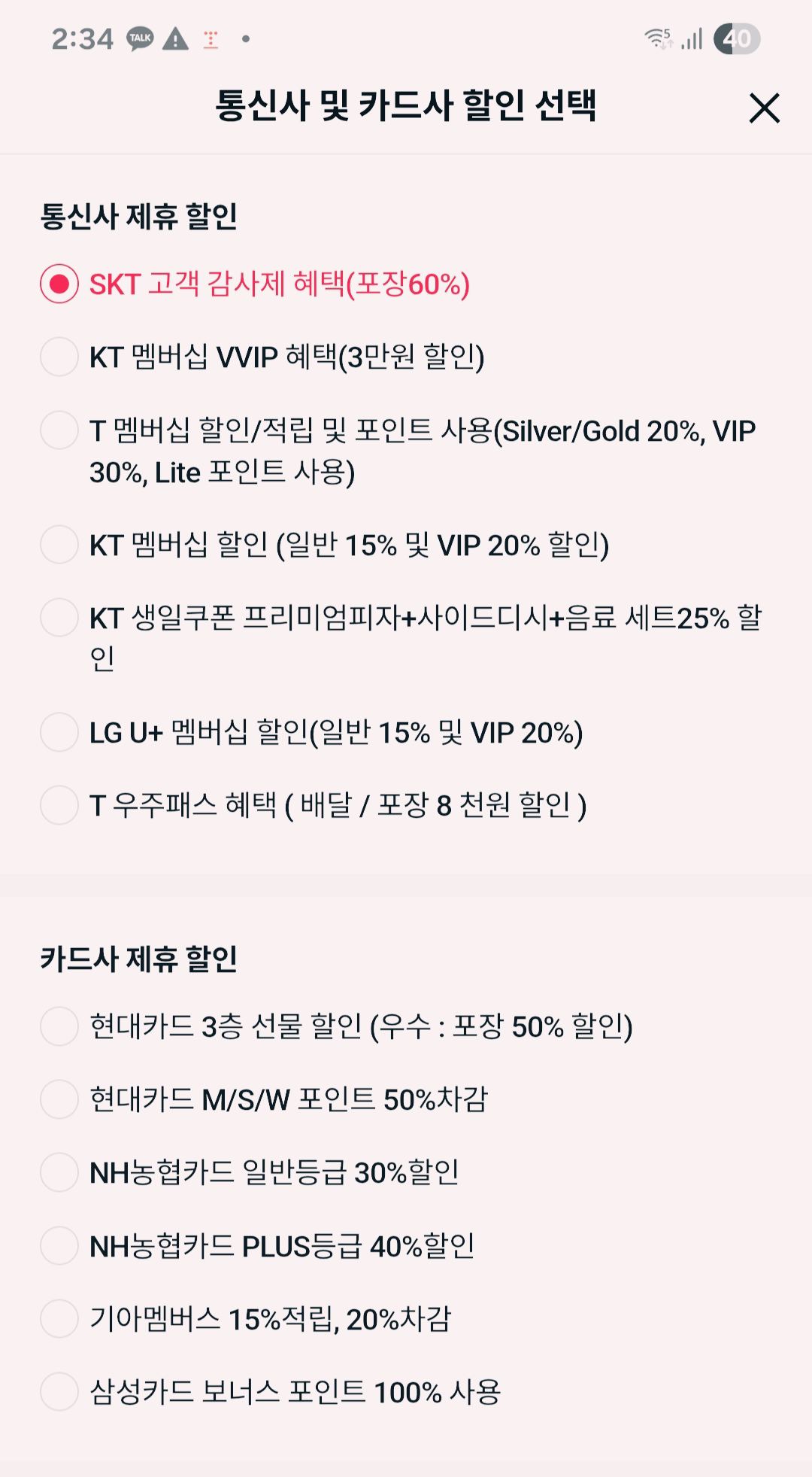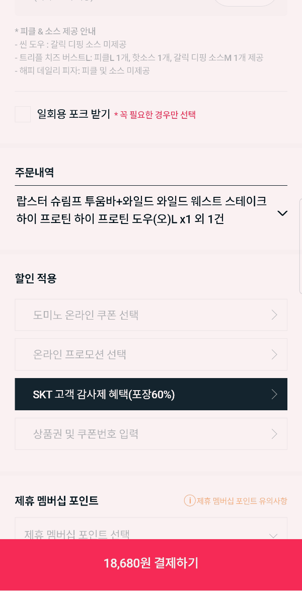 - 통신사 제휴 할인(SKT 고객 감사제 혜택(60%)) 선택하기