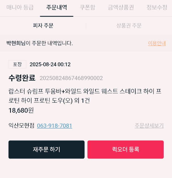 - 배달 쿠폰으로 포장 주문 시 할인 적용이 되지 않습니다.