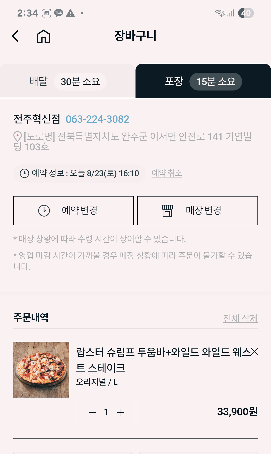 30분 거리에 다른 지역을 선택했더니 주문이 가능한 곳이 있어 사전예약 했어요