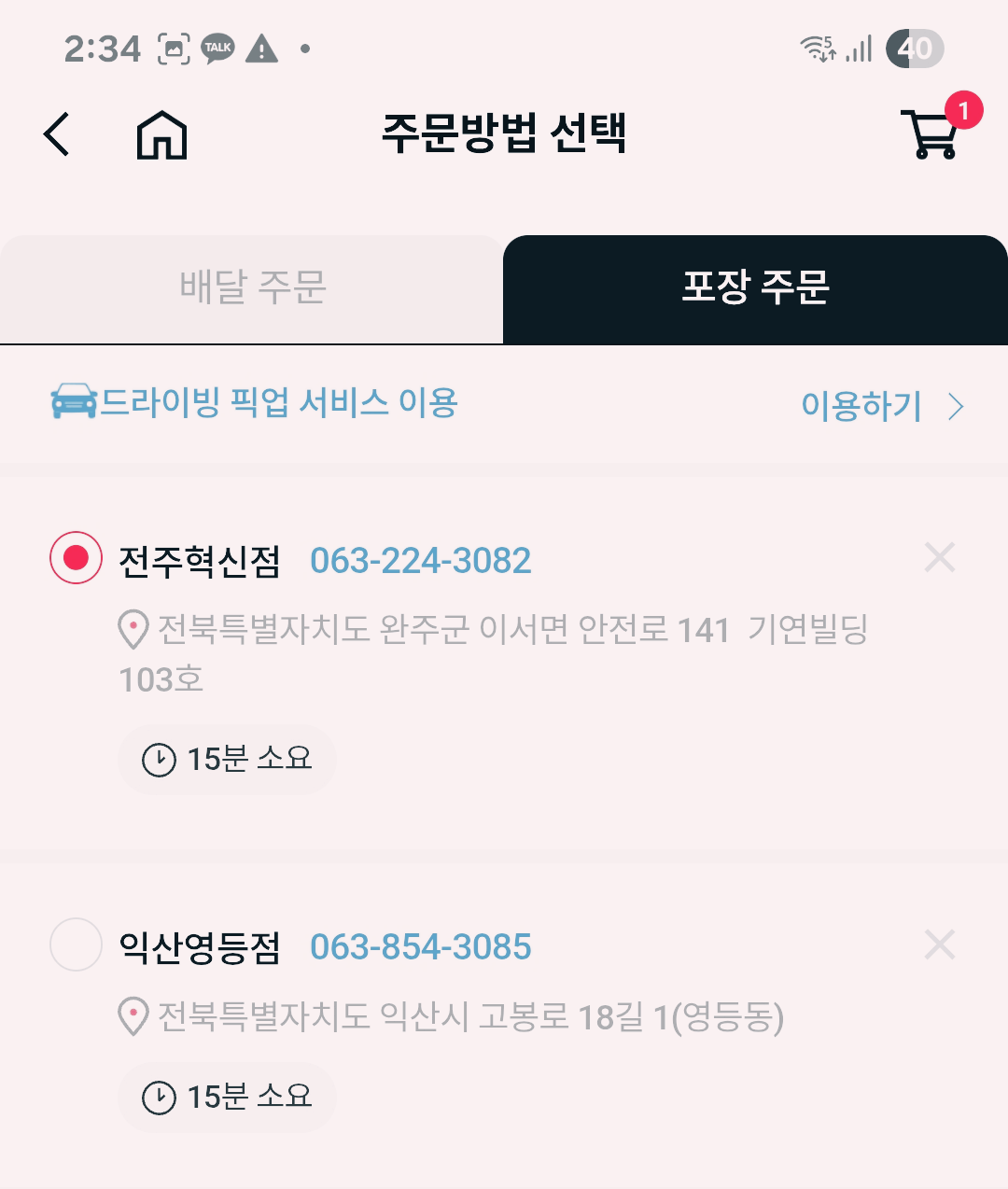 매장이 많은 쪽을 선택해서 주문해 보세요.