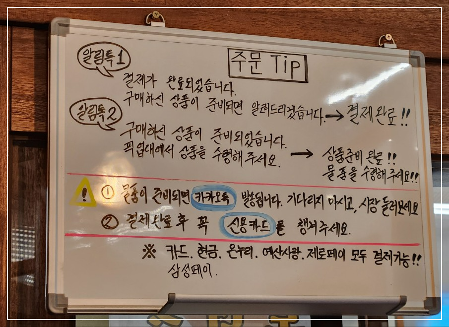 물건이 완료되면 카카오톡으로 문자를 받을 수 있어 기다리지 않고 시장을 둘러볼 수 있답니다.