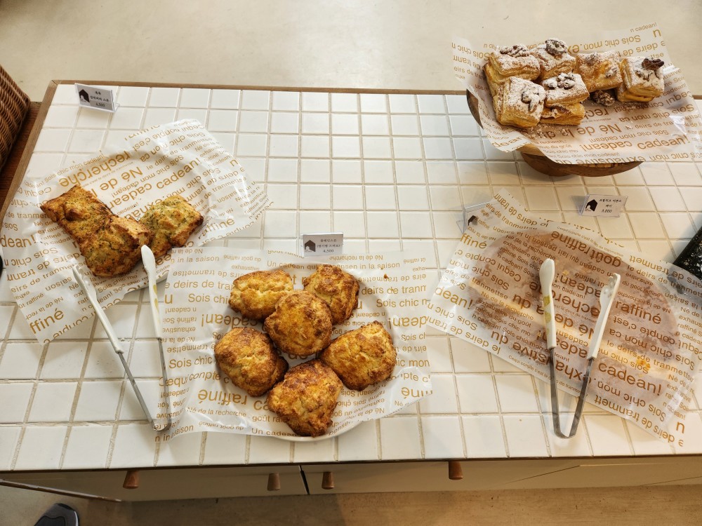 차와 빵이 준비되어 있고 또 좋았던 점은 포크와 접시 티슈등을 빵 진열장에 함께 둠으로써 여유 있게 사용할 수 있게 해 주신 것도 참 좋았습니다.