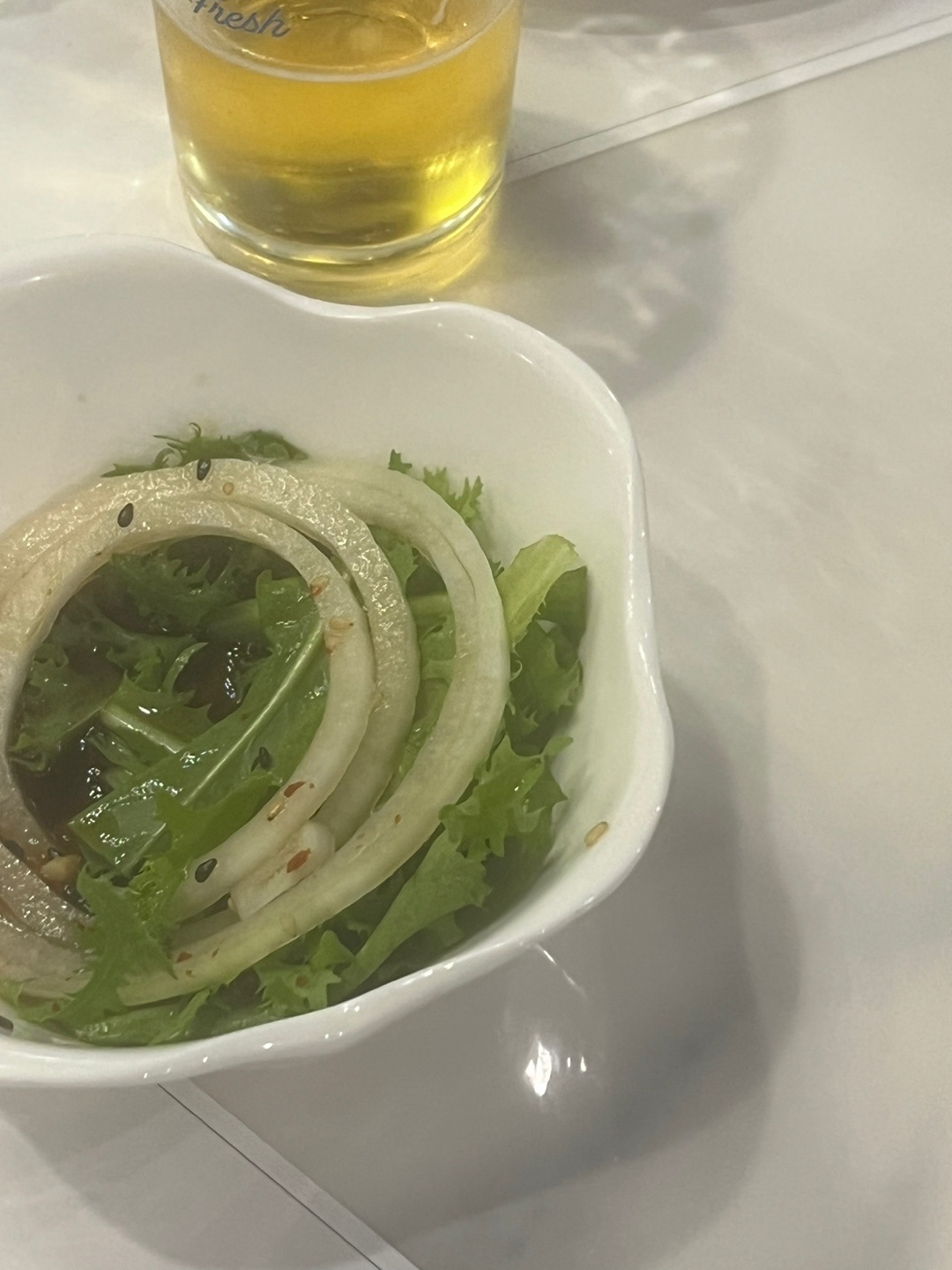 3가지 기본 반찬과 양파 샐러드도 함께 준비해 주시네요.