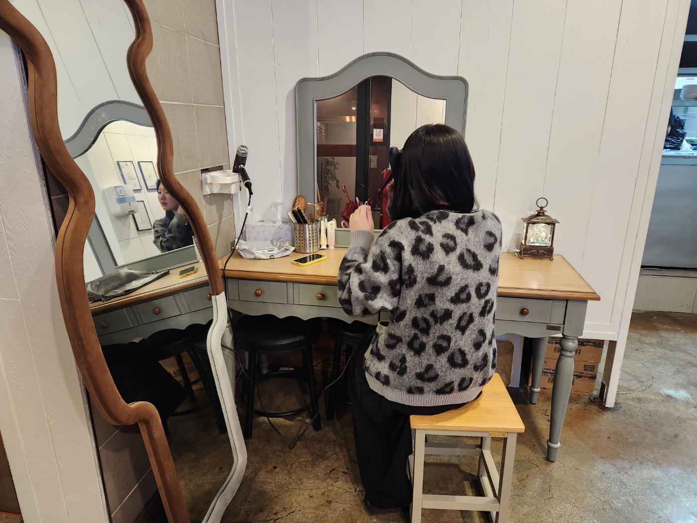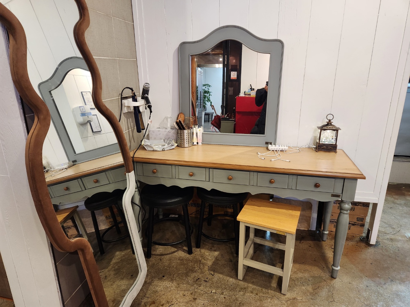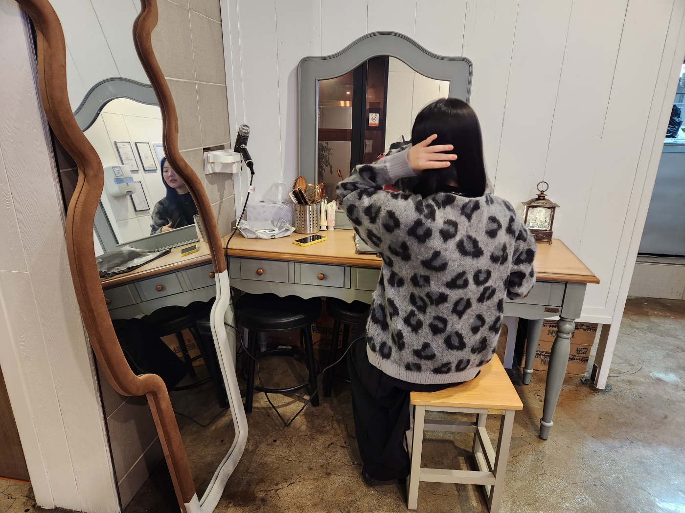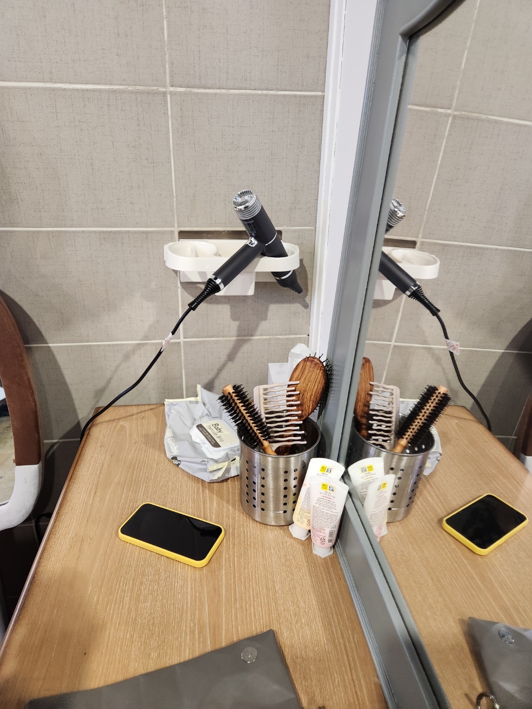 식사를 마치고 나오는데 카운터에서 계산을 마치고 보면 거울과 드라이기, 고대기가 준비되어 있는데요. 식사 후 용모 정돈을 위해 사장님이 센스 있게 만들어 주셨더라고요. 처음엔 다소 어색했지만 사용해 보니 참 편리했답니다.