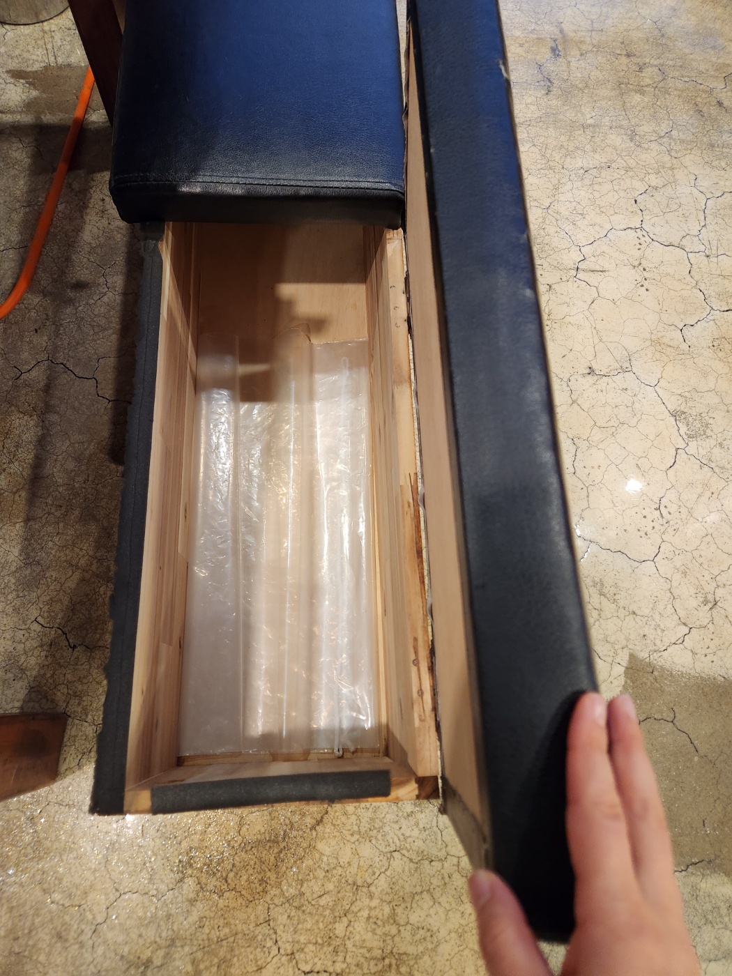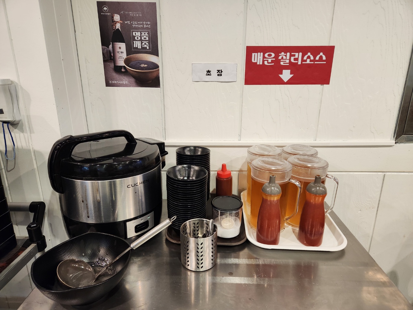 테이블을 잡고 나면 앉는 의자에 뚜껑이 열려요. 바닥에 비닐 팩이 준비되어 있으니 그 비닐에 옷을 넣어도 되지만 저는 겨울 점퍼라 그냥 그 위에 올려놓고 편안하게 식사를 했네요.
