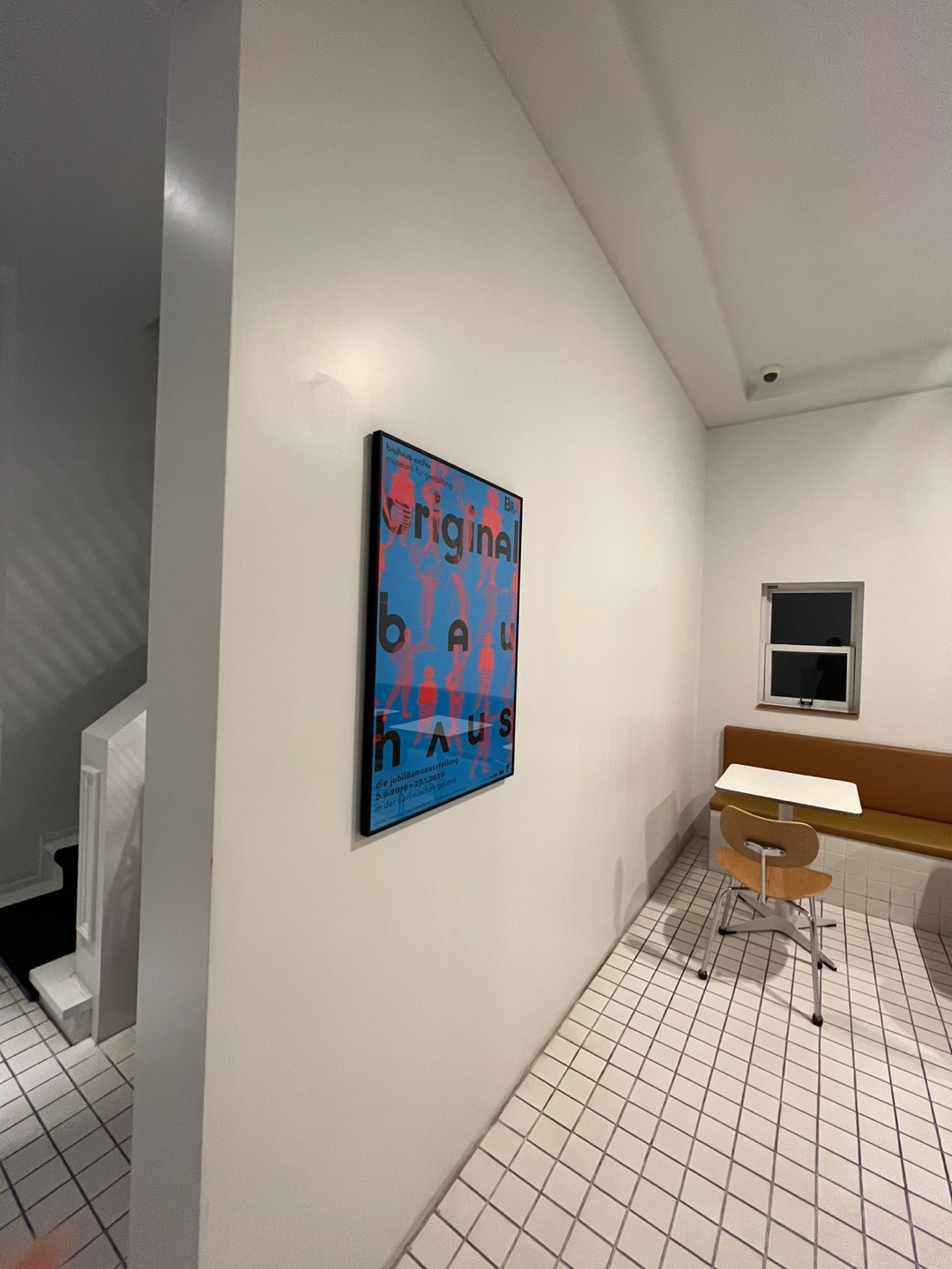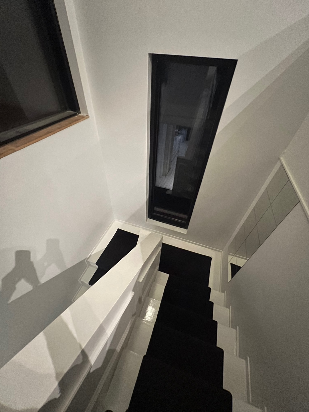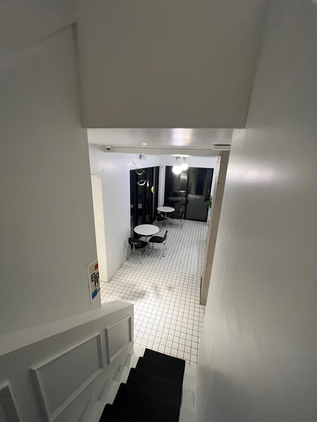 바닥은 하얀 타일로 되어있으며 검정 카펫이 깔린 2층 계단의 멋스러움이 느껴지네요.
