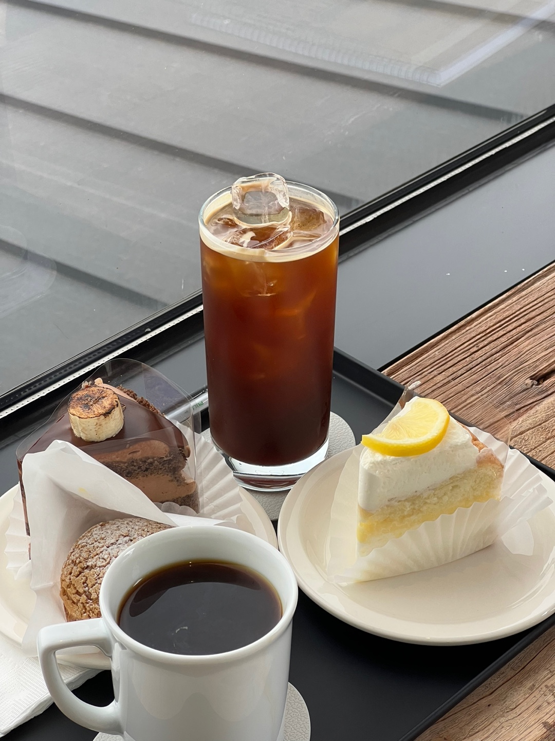 케이크에는 역시 아메리카노겠죠. 커피와 레몬우유 케이크, 초코바나나 케이크, 구운 슈크림 빵을 주문했답니다.