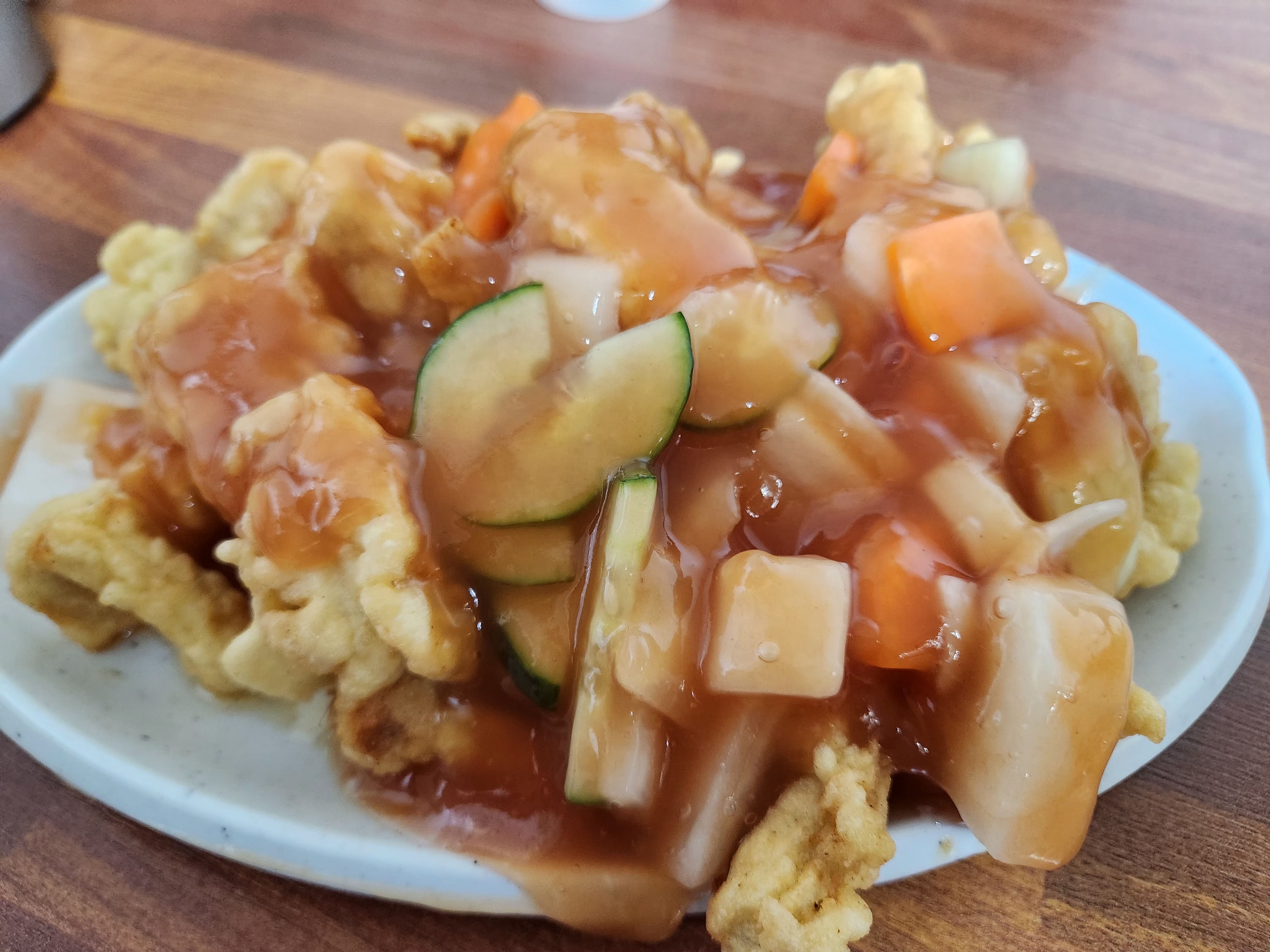 탕수육은 부드럽고 고기도 큼직해서 씹는 식감이 있고요, 아삭한 오이, 당근, 약간 매콤함이 살아있는 양파가 있어 탕수육의 느끼함을 잡아주는 것 같아요.