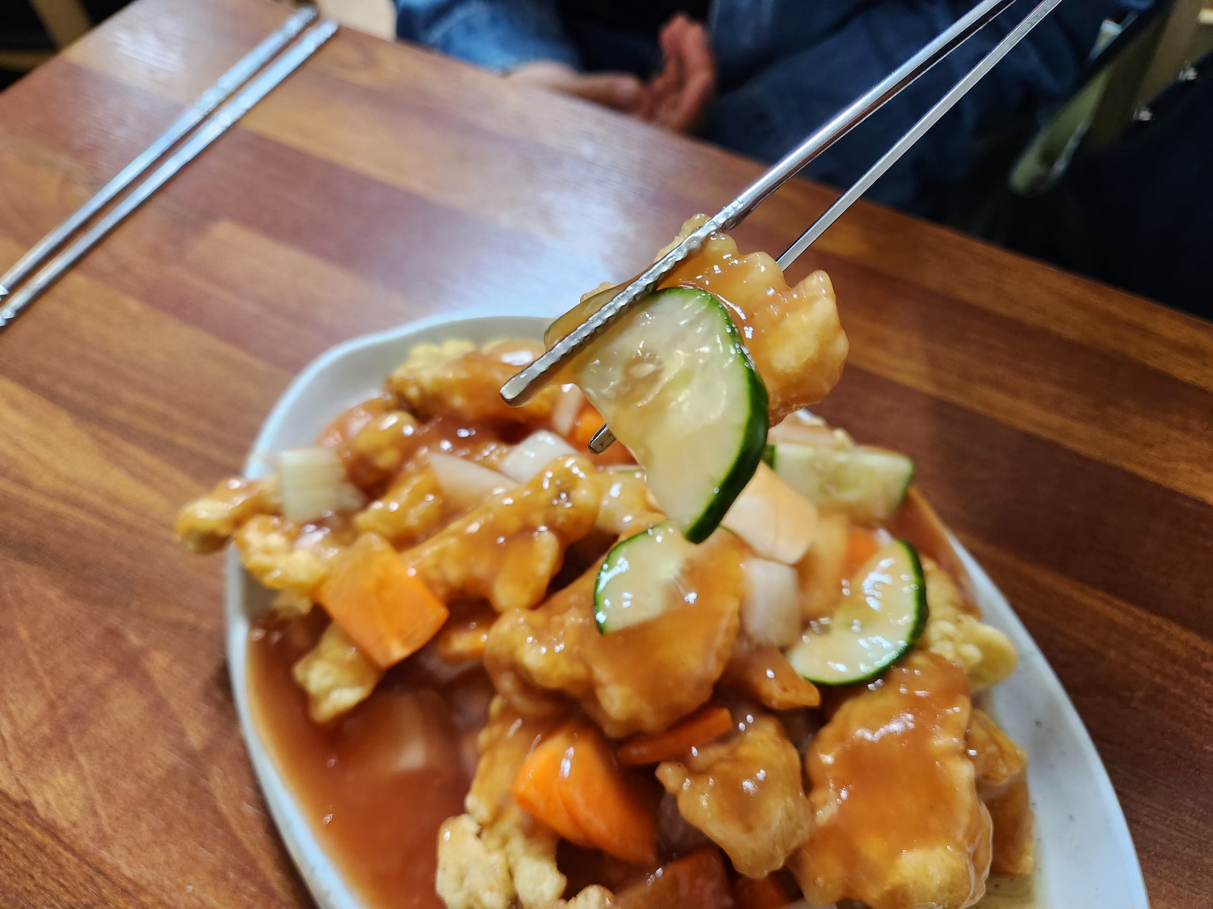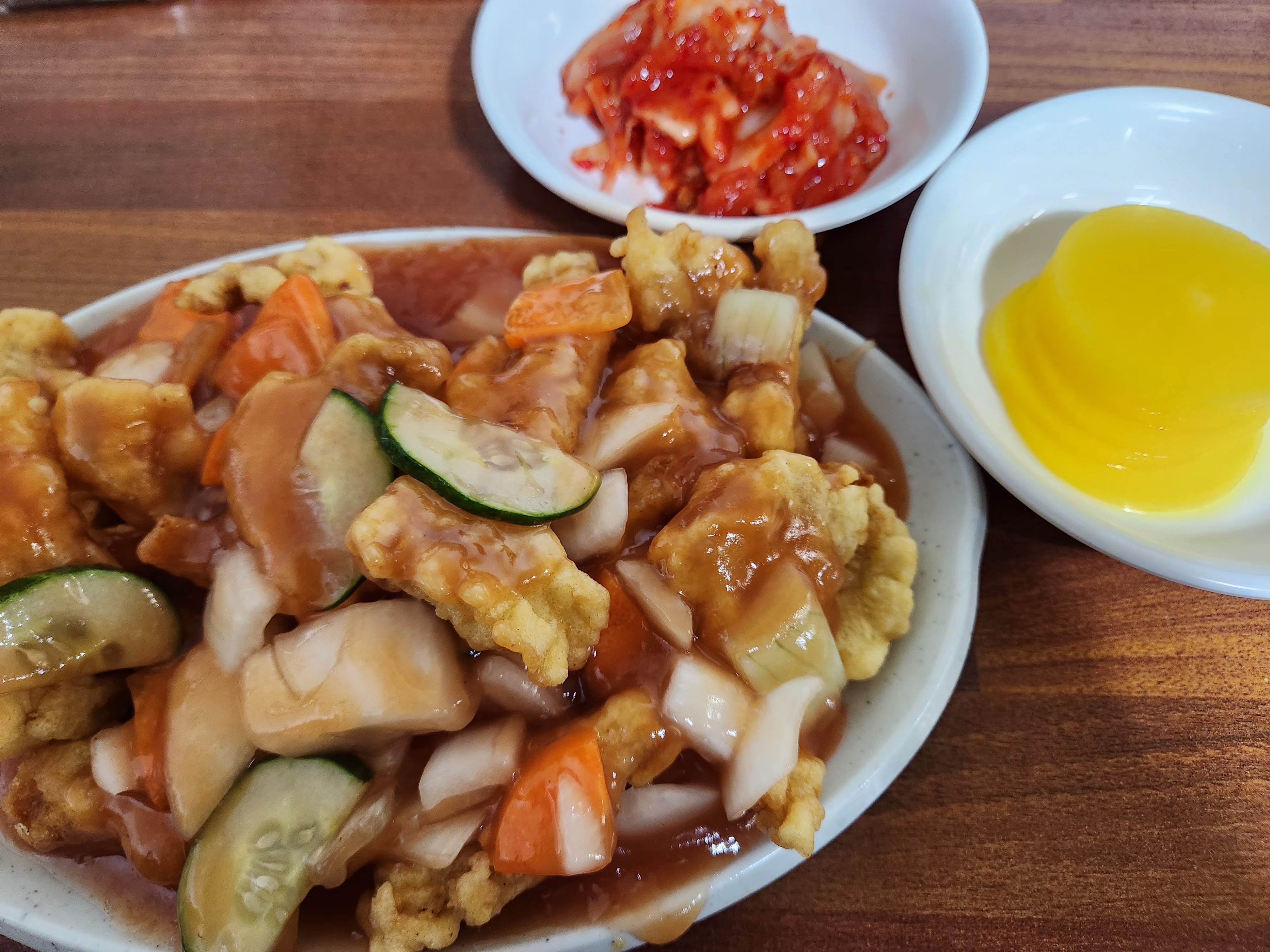 탕수육은 부드럽고 고기도 큼직해서 씹는 식감이 있고요, 아삭한 오이, 당근, 약간 매콤함이 살아있는 양파가 있어 탕수육의 느끼함을 잡아주는 것 같아요.