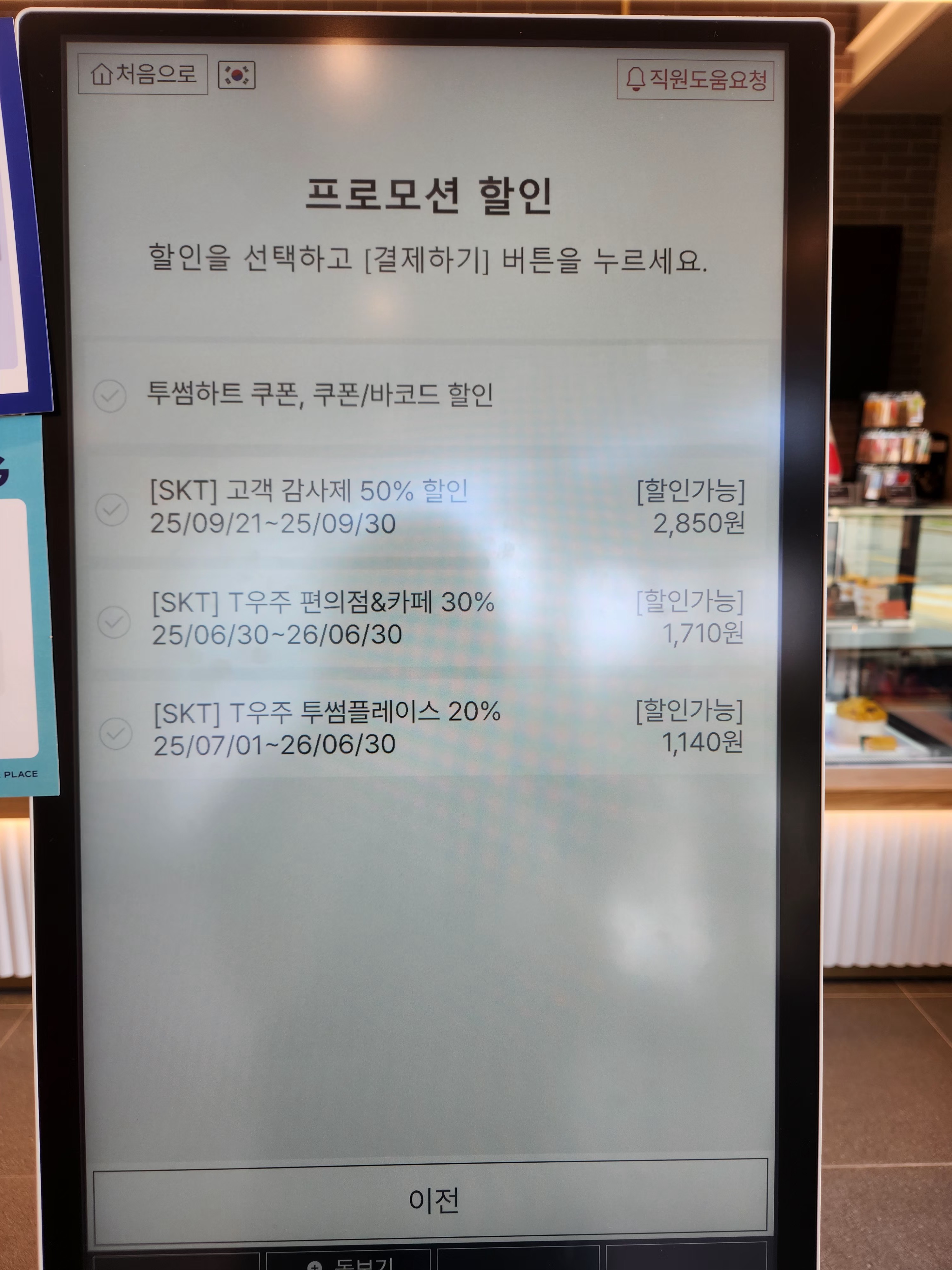 그런데 현장에서 직접 주문해 보니 SKT멤버십 할인이라는 버튼이 눈에 확 들어오니